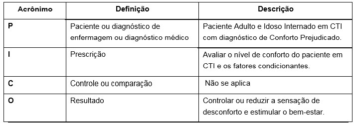 Para a busca bibliográfica das evidências foi utilizada uma combinação dos componentes da estratégia PICO: (P) Paciente idoso internado em UTI com Conforto Prejudicado (Unidade de terapia intensiva) AND (I) Avaliar o nível de conforto do paciente em CTI e os fatores condicionantes AND (C) Controle ou comparação AND (O) Controlar ou reduzir a sensação de desconforto e estimular o bem-estar.